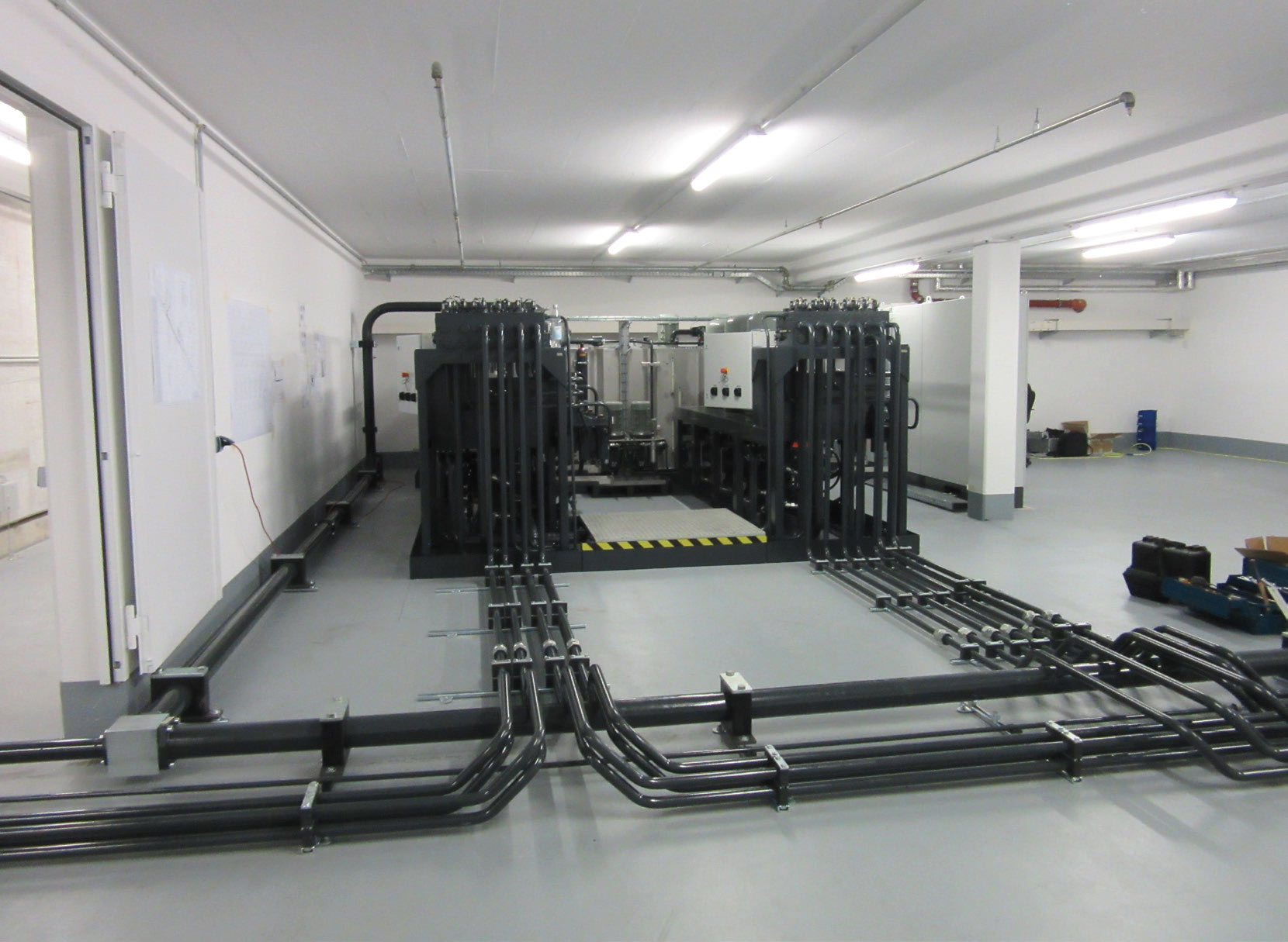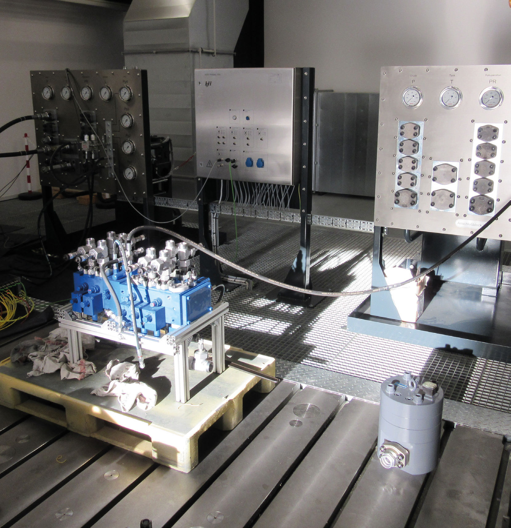 Every test station (5 in total) can individually run autonomous test cycles. The hydraulic system is suitable for a maximum pressure of 420 bar at a maximum power of 450 kW and can regenerate hydraulic energy into electrical energy for environmental friendly testing.